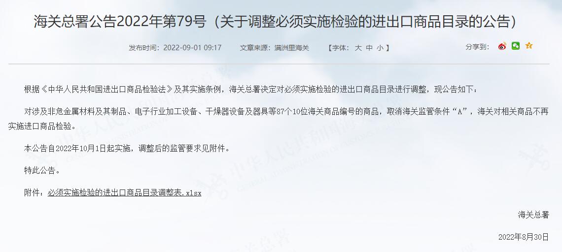 海關(guān)總署公告2022年第79號(關(guān)于調(diào)整必須實(shí)施檢驗(yàn)的進(jìn)出口商品目錄的公告)