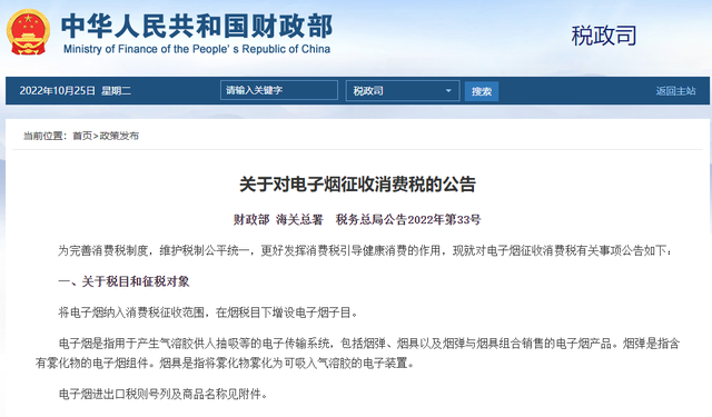 為完善消費稅制度,維護稅制公平統一,更好發揮消費稅引導健康消費的作用,現就對電子煙征收消費稅有關事項公告如下: