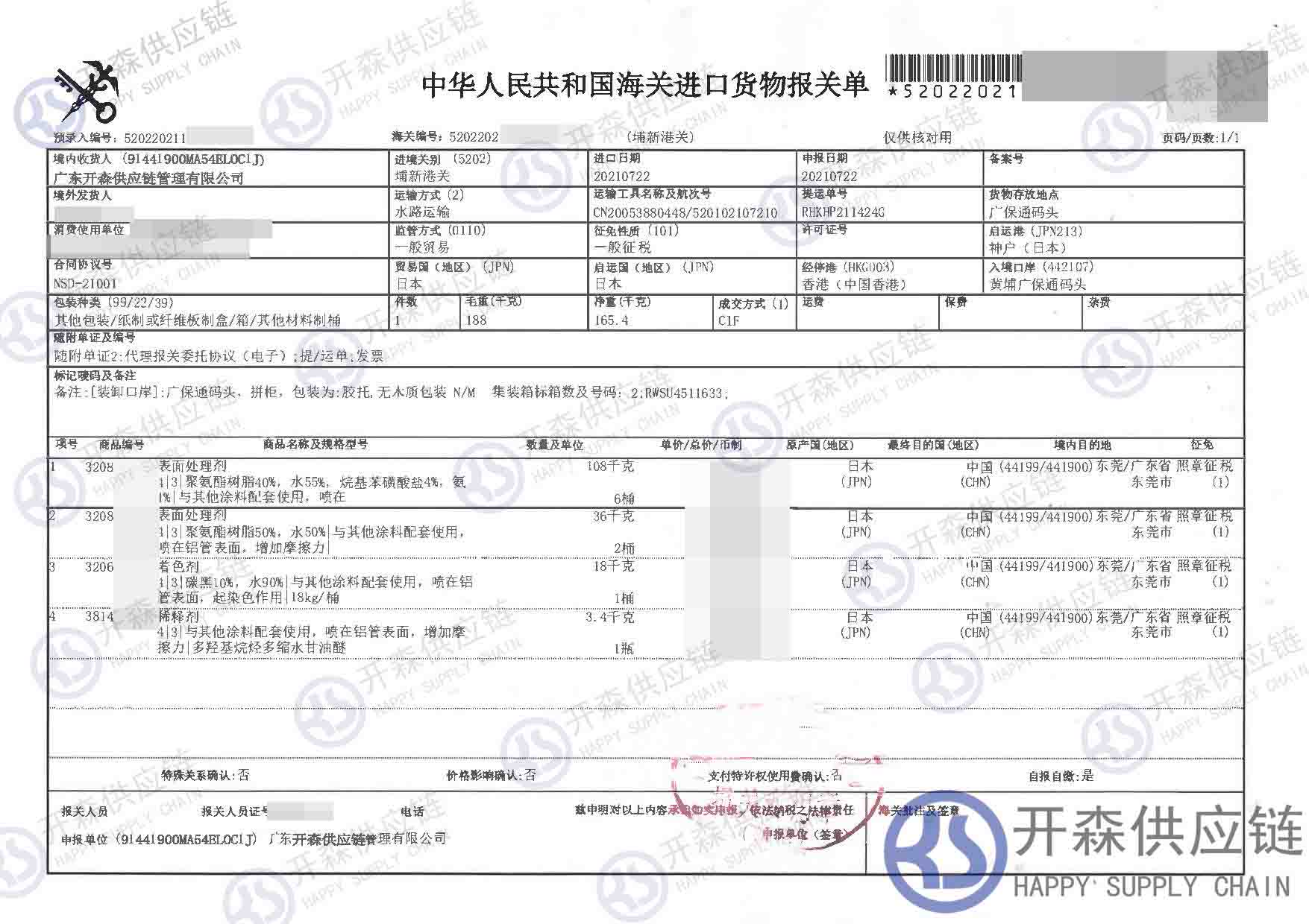 【本文結語】 上述就是【進口案例】表面處理劑進口報關代理服務的全部內容,希望能對您有所幫助,如有化工品進口報關上任何疑問及問題可隨時在線聯系我們或撥打 18002611553,開森供應鏈擁有豐富的化工品進口報關操作經驗及案例,10余年進口經驗為您所用,各類進口疑難都能為您一一解答及協助快速處理解決!