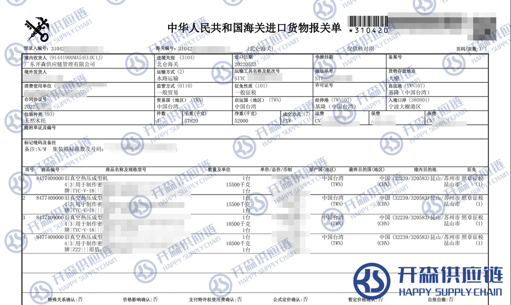 【本文結語】 上述就是寧波港舊真空熱壓成型機進口報關清關代理案例【經典案例】的全部內容,希望能對您有所幫助,如有二手機械進口報關上任何疑問及問題可隨時在線聯系我們或撥打 18002611553,開森供應鏈擁有豐富的二手機械進口報關操作經驗及案例,10余年進口經驗為您所用,各類進口疑難都能為您一一解答及協助快速處理解決!