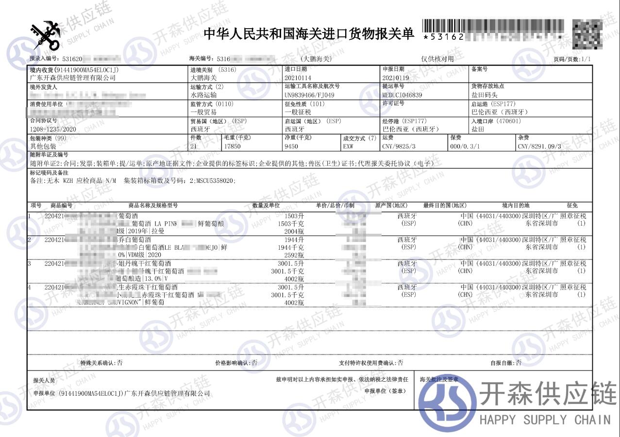 【本文結(jié)語】 上述就是【進口案例】西班牙葡萄酒進口報關代理服務的全部內(nèi)容,希望能對您有所幫助,如有葡萄酒進口報關上任何疑問及問題可隨時在線聯(lián)系我們或撥打 18002611553,開森供應鏈擁有豐富的葡萄酒進口報關操作經(jīng)驗及案例,10余年進口經(jīng)驗為您所用,各類進口疑難都能為您一一解答及協(xié)助快速處理解決!